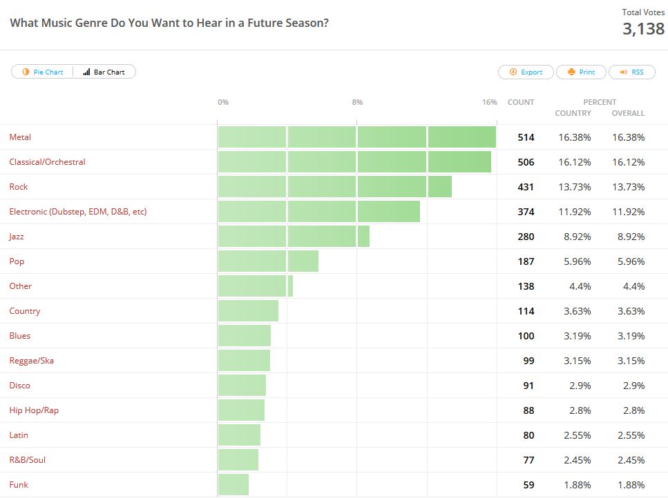 - Le résultat de ce sondage sur le genre que la commu voudrait qu'il soit présent dans la prochaine saison est donné. Indice: basse, guitare électrique, batterie...