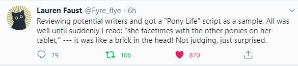 5. Lauren Faust a donné son avis sur un script d'épisode de 'Pony Life' et semble sceptique mais a voulu être claire sur ce message [Lien 1] [Lien 2]
